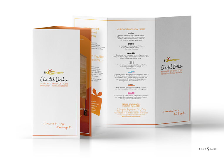 Plaquette commerciale A4 ouverte, produite pour la creatrice du massage synergetique "Chantal Brehin".